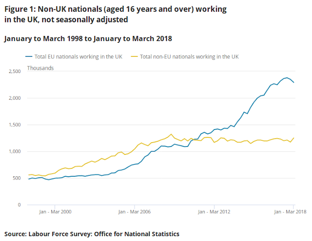 Notice that the “sour grapes” effect of the referendum, the “May 2016 trend” that the Bank uses to exaggerate the “ill-effects” of the Referendum, does not occur when we consider GDP per head, it is an artefact of slightly lowered migration into the UK, as can be seen from the decline in migrant workers from the EU in 2017 below.