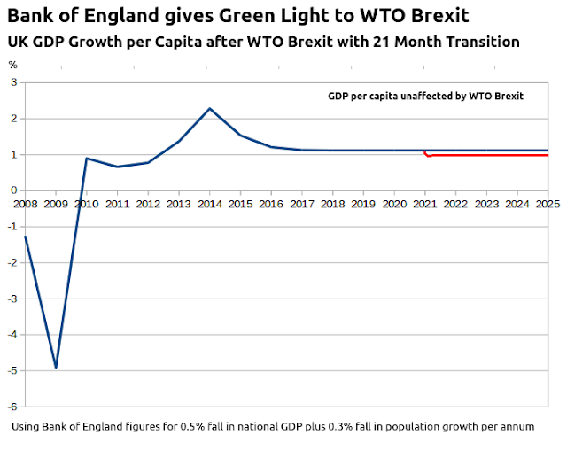 Even the Bank of England did not really believe the “worst case” scenario, the one that got all the headlines, would happen. Its realistic scenario for a near to “no-deal ” Brexit involves a transition period of 21 months in which the basic requirements for UK EU trade such as mutual recognition are sorted out. Even though it is clear the Bank was trying to make a case for avoiding a WTO Brexit the outcome of this straightforward scenario is acceptable to anyone who believes in self government for the UK. The Bank of England Graphic for WTO Brexit with a 21 month transition looks awful at first sight: