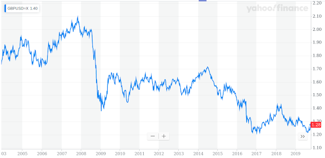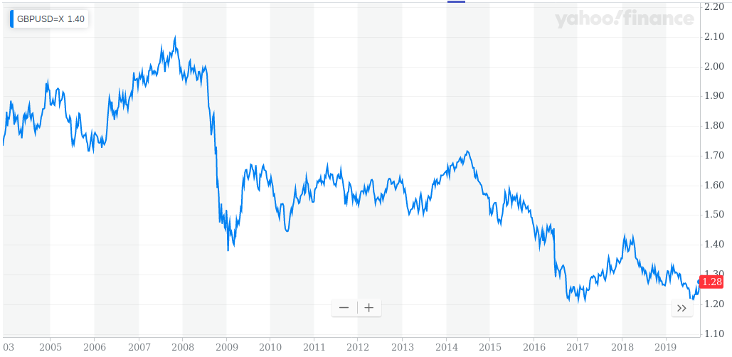So the principle, headline grabbing predictions, were entirely wrong. The only prediction that was vaguely right was that the pound would fall over the 2 years but this was right for the wrong reasons, the pound is falling because of a long standing Current Account Deficit on the Balance of Payments (largely a deficit with the EU). The pound had been falling steadily since 2014: