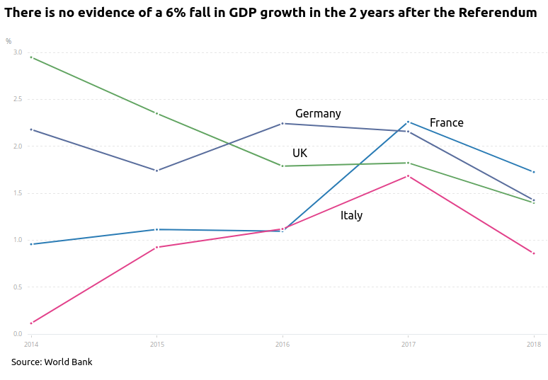 The 2016 predictions are widely accepted as being wrong by those who have studied them. They predicted that GDP would be 6% lower two years after the Referendum (a £120bn loss) and unemployment would rise by 500,000. When we compare UK GDP growth with the other leading EU economies it can be seen to be following a similar trend: