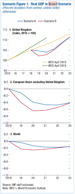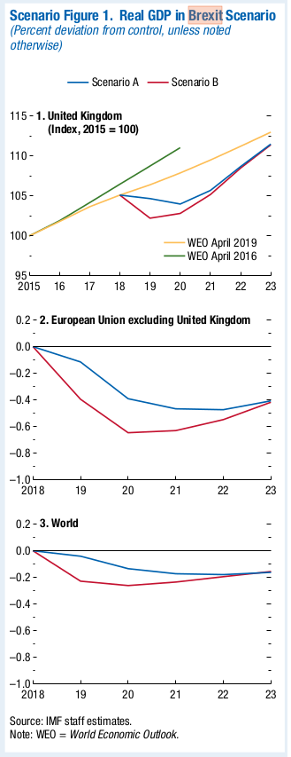 In the case of a WTO Brexit the IMF has a Scenario A that has small scale imaginary effects and in scenario B large scale imaginary effects. No one actually knows how disrupted borders will be. The French reassure us that there will be no disruption on their side and the government now say disruption will be minimal on the UK side. However, the IMF are ignoring those who control the borders and are using an imaginary numbers for disruption.
