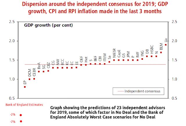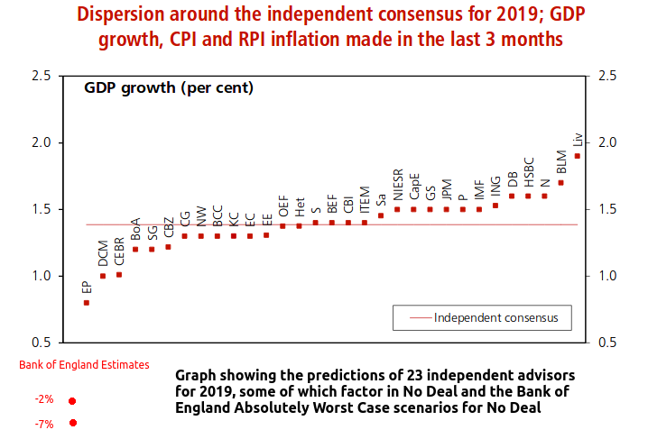 The consensus of independent economic forecasts for 2019 is reasonable growth for the UK economy, probably higher than that of Italy and Germany, whether there is a deal or not. The exception to these predictions are those of the Bank and Treasury.
