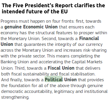 The Five President’s Report, produced by the presidents of the European Commission, Council, Parliament, Eurogroup (Eurozone) and Central Bank, made it clear that political union was the goal of the EU.
