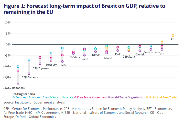 Ten of the thirteen independent, non-government economic forecasts predict that all and any versions of Brexit have less than a five percent effect on the economy over 15 years. Less than 5% over 15 years. The use of the predictions of Rabobank – a rabidly anti-Brexit Dutch bank and the LSE CEP Dynamic model make it look like there is a small chance that No Deal Brexit could be awful. No-one believes these sources and they are seldom quoted elsewhere. Take them out of the reckoning and the worst that can be said about No Deal is that it might slightly reduce GDP once population effects are subtracted. Or it might not. The predicted changes are so small at less than 0.3 per cent a year and extended over such a long period that they are absurd. (See GDP predictions are reliable only in the short term (Economist Dec 15th 2018) .