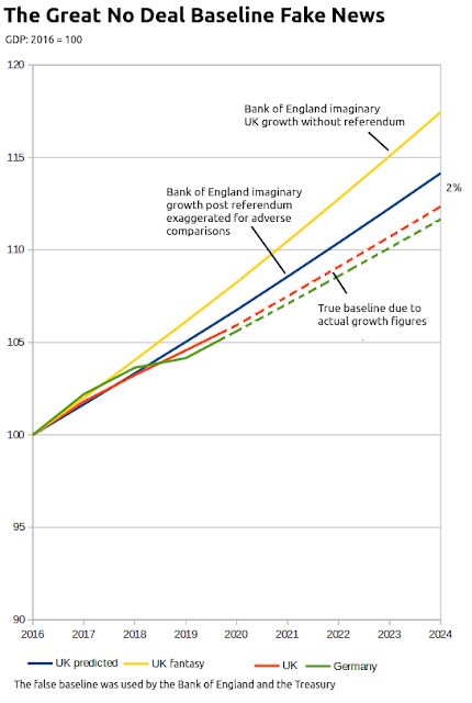 Indeed, the Bank of England “scenario” for a No Deal Brexit was less severe than the ordinary, annual scenario used for stress testing banks, even before the false baseline became clear. The Bank has already adjusted its “scenario” for No Deal to be 2% less severe but was careful not to state clearly that this was because the baseline had changed – probably because this would draw attention to baselines in all the Remain economist’s reports.