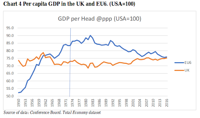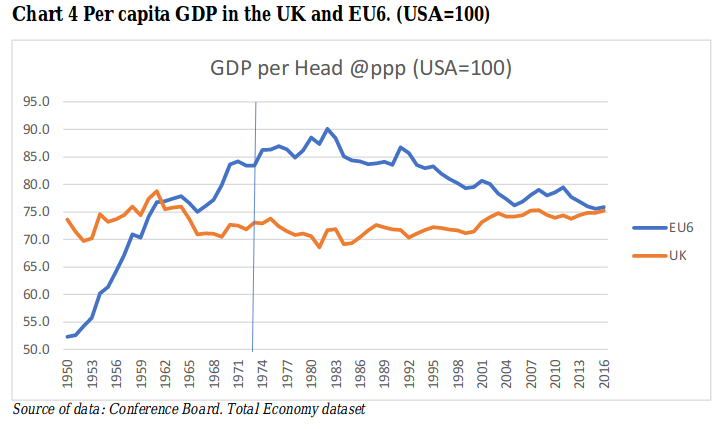 In general the UK has just managed to keep its GDP per head as a constant proportion of US GDP per head.