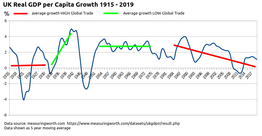 It should be made clear that there is an optimum level of foreign trade for any country. It is obvious that if all production occurs overseas there will be no work in this country. It is also obvious that if no production occurs overseas there will be insufficient resources available for production in this country. As in most processes there is a balance point, there is an optimum level of foreign trade. It was shown in the 1930s that when foreign trade reaches a “sweet point” then GDP Growth per capita is optimised (See Note 1 below). In 2019 this was probably about 40% of UK GDP (imports + exports).