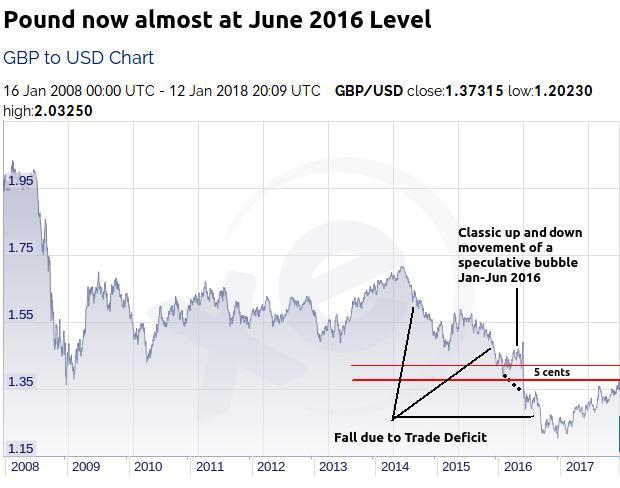The pound fell from 2014 to the beginning of 2017 because of the huge UK trade deficit. Around January to June 2016 there was a speculative bubble where gamblers bought pounds – clearly in expectation of a Remain win – which caused a gain in the value of the pound then sold them the day after the referendum causing all the gains to be suddenly wiped out. This sudden sale of pounds was impressed on an already falling pound. The resulting, relatively small, but very sharp fall in the pound had Remain supporters cheering.
