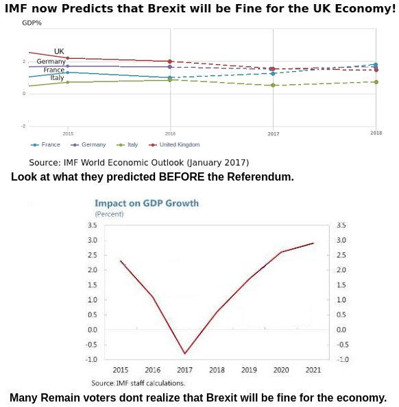 In both the IMF and HM Treasury cases Article 50 had not yet been announced when the predictions for UK GDP were modified back to the normal range for a developed country. Surely little to do with the underlying “uncertainty” assumptions in the Treasury and IMF models had changed between June 2016 and January 2017 so why did the Treasury and IMF abandon their pre-referendum predictions? The answer is that organisations such as the IMF cannot retain public confidence if their predictions are massively discrepant from reality. Those who made the predictions at the IMF knew that their predictions were just imaginary figures designed to help HM Government affect the UK electorate and so abandoned them once their work of affecting the Referendum had been done so that they would not threaten the credibility of the IMF.