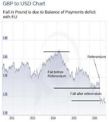 The pound had been high due to the flight of investment from the Eurozone into the UK. The high value of the pound was a partial cause of the huge trade deficit with the EU and was hindering exports generally so the fall in the pound since 2014 is welcome. Note that the fall in the pound was happening before the EU Referendum and is due to the Balance of Payments deficit and the mild Eurozone recovery since 2014: