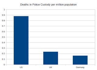 Under 20 people, black and white, die per year in UK police custody. On average 1.3 black people die in police custody per year out of approximately 900,000 arrests a year.