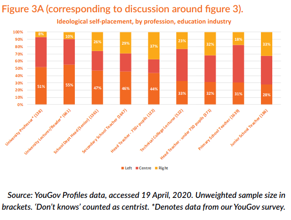 Remember, the “fairly right” were Conservatives. Why the Report did not just use UKIP/Brexit Party, Conservative, LibDem, Labour/Green and Trotskyist/Stalinist as the labels is a mystery. According to the survey 8.2% of academics were “fairly right” – ie: Conservatives – in 2020.